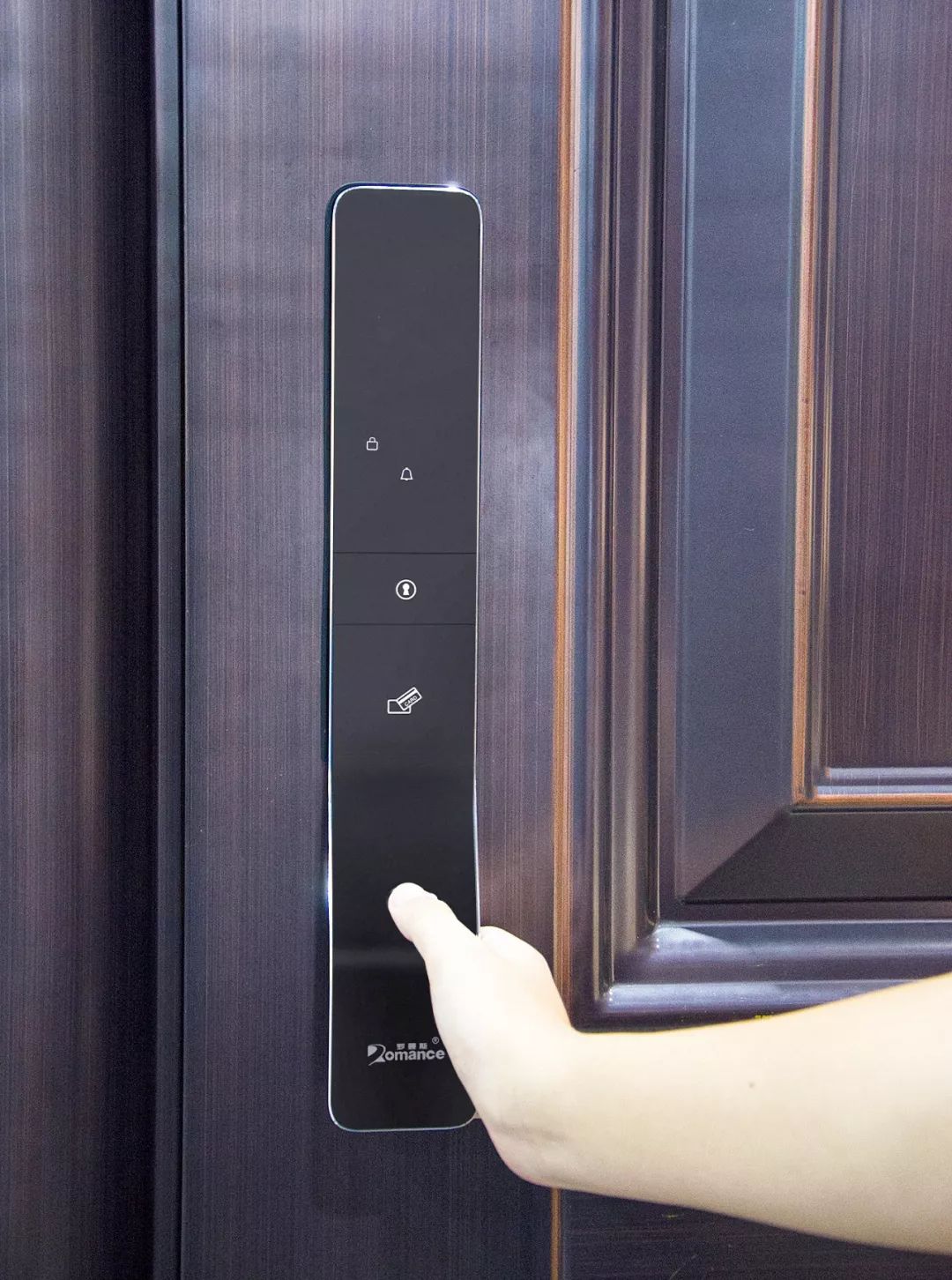 ? ? ? ?前鎖板(右)上分別有密碼識別區、門鈴按鍵、IC卡感應區、指紋感應區、logo。