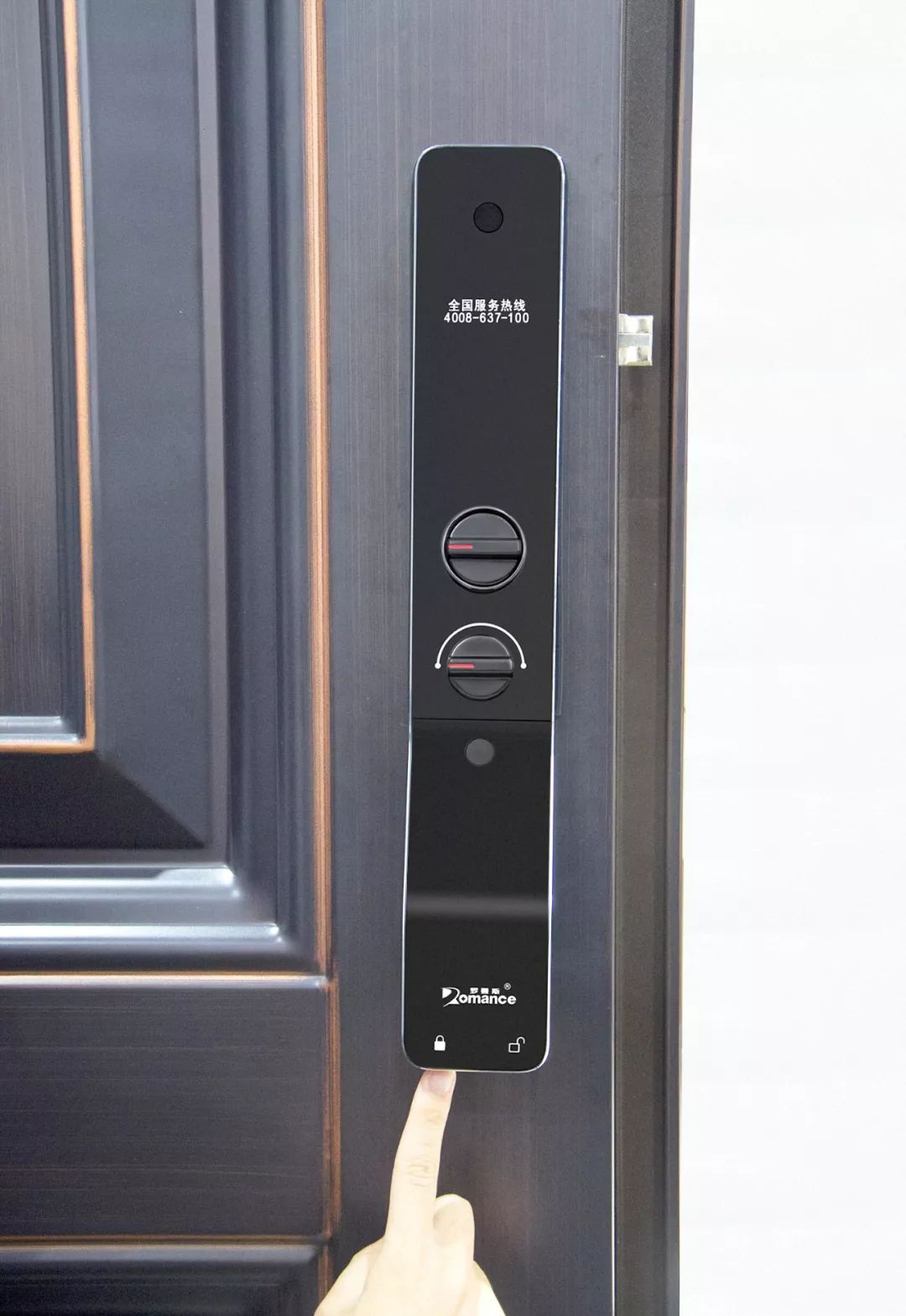 ? ? ? ?后鎖板(左)上分別有全國400售后電話、室內應急旋鈕、內保險旋鈕、一鍵開上鎖。